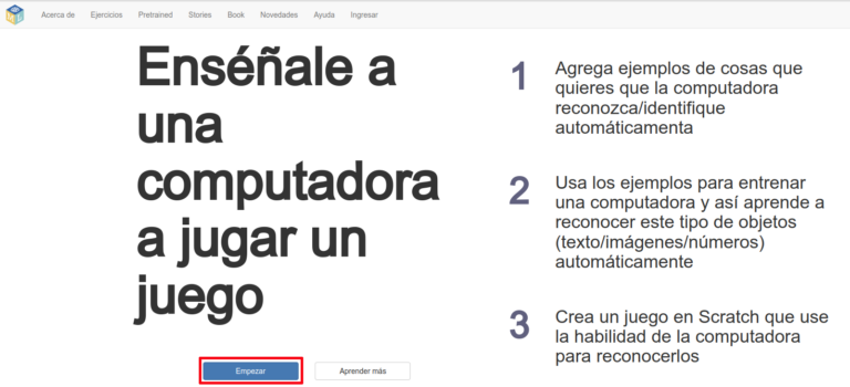 La primera pantalla de la herramienta explica los tres pasos que tienes que seguir para crear tu modelo de aprendizaje automático: agregar ejemplos, entrenar el modelo para que aprenda y usar el modelo desde cualquier aplicación en Scratch.