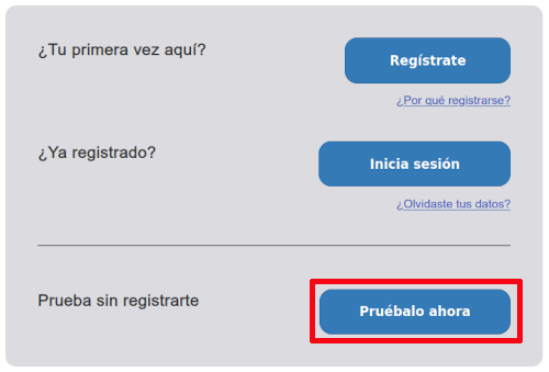 Al pulsar sobre el botón “Empezar”, verás que tienes la opción de registrarte, pero también puedes probar sin registrarte. La principal diferencia es que, si te registras, podrás guardar los modelos de aprendizaje automático para poder utilizarlos más adelante. De momento, como solo quiero que pruebes cómo funciona, debes pulsar sobre el botón “Pruébalo ahora”.