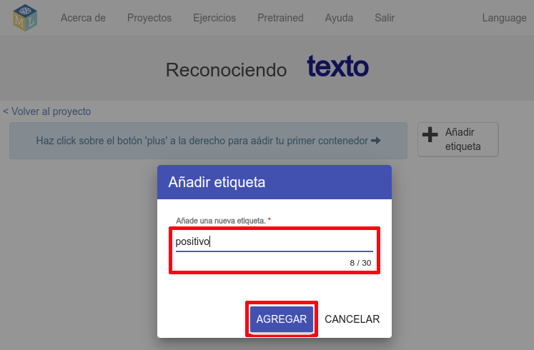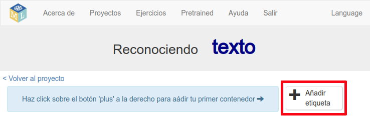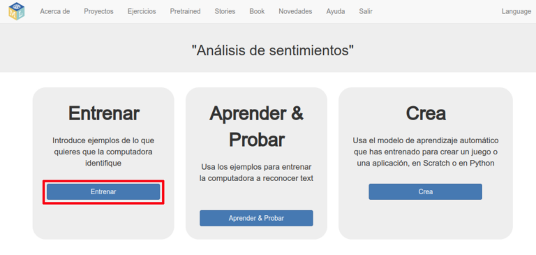 El primer paso para crear un modelo de aprendizaje automático consiste en entrenar el modelo, es decir, mostrarle ejemplos de lo que quieres que la IA aprenda a reconocer. En la pantalla donde se ven los tres pasos para crear tu proyecto, pincha en la opción “Entrenar”.