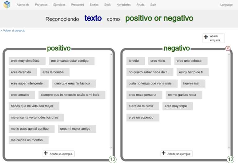 ¿Ves el número que aparece en la esquina inferior derecha de cada contenedor? Te está diciendo el número de ejemplos que has añadido a cada clase. En la imagen de arriba tenemos 13 ejemplos positivos y 12 negativos. A estos ejemplos se les conoce como conjunto de entrenamiento.