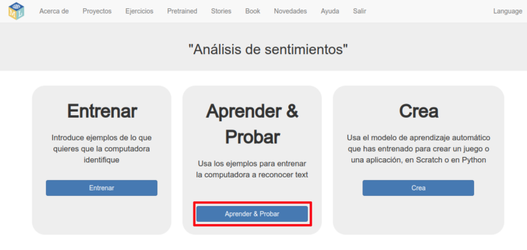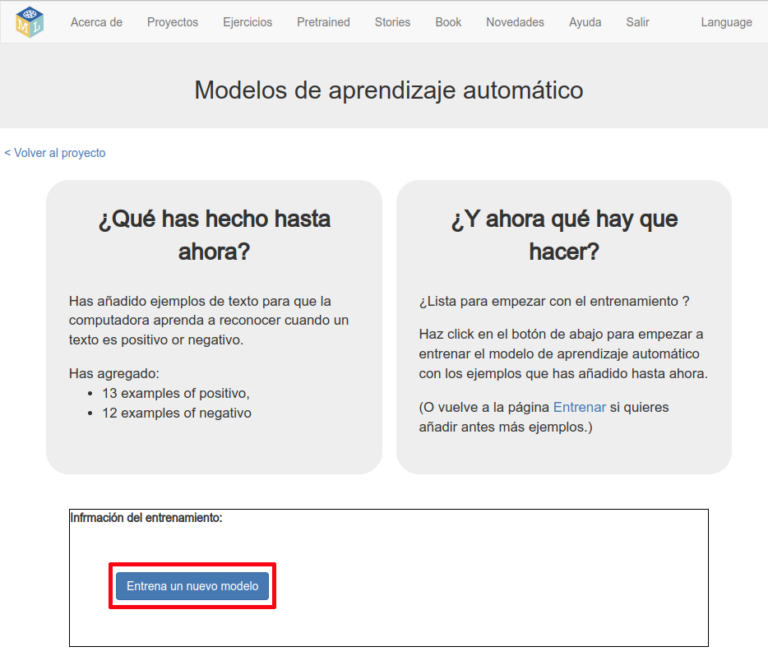 Cuando acabe el entrenamiento esta información cambia y aparece un botón que dice “Borra este modelo”. ¡Esto indica que el modelo ya está entrenado y ya ha aprendido a partir de nuestros ejemplos!