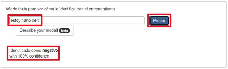 Cuando el modelo termina de clasificar, verás que te dice a qué clase pertenece la frase y cómo de seguro está de ello. Al escribir “estoy harto de ti” el modelo me ha contestado que el texto es “negativo” con una seguridad (confidence en inglés) del 100%.