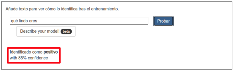 ¡Bien! El modelo lo ha identificado como un comentario “positivo”, aunque con un poco menos de seguridad: un 85%. Lo importante es que nuestro modelo ha aprendido de los ejemplos que le hemos pasado y es capaz de clasificar frases que no había visto nunca.