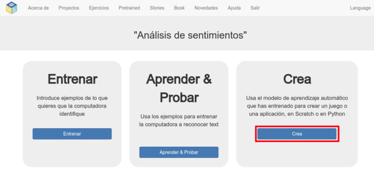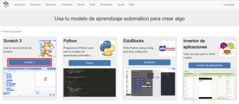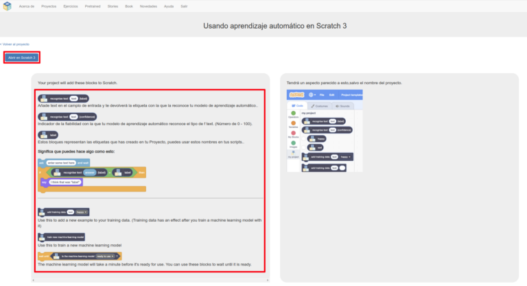 En la siguiente pantalla, te explica cuáles son los bloques principales para trabajar con tu modelo de IA en Scratch. Pincha en “Abrir en Scratch 3”, en la esquina superior izquierda, para empezar a crear tu programa.