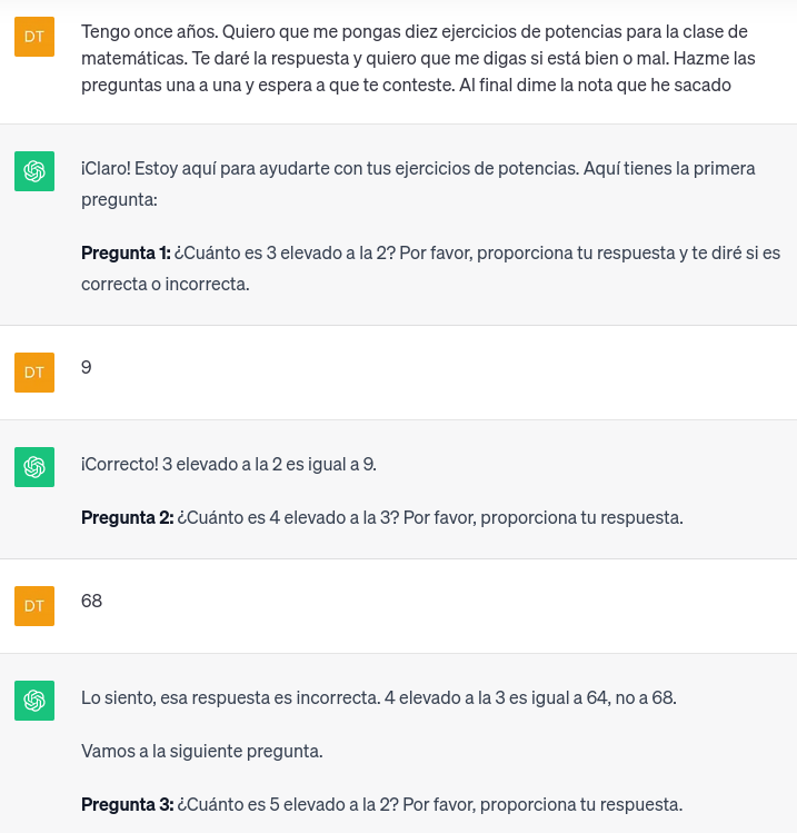 Imagina que estás estudiando las potencias en clase de matemáticas. Podríamos decirle algo como esto: “Tengo once años. Quiero que me pongas diez ejercicios de potencias para la clase de matemáticas. Te daré la respuesta y quiero que me digas si está bien o mal. Hazme las preguntas una a una y espera a que te conteste. Al final dime la nota que he sacado”.